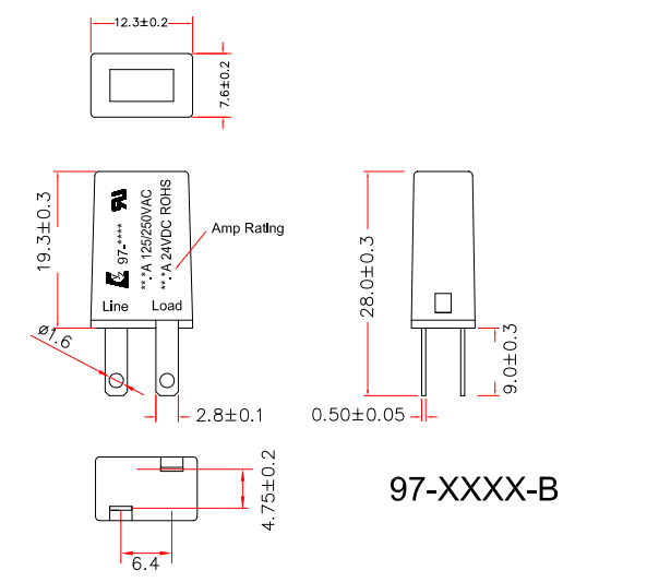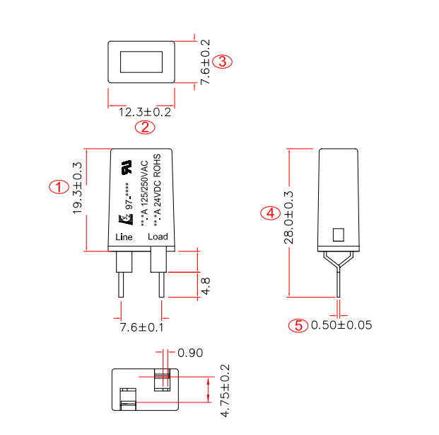 額定電流(rating):0.8A-15A 輸入電壓(Input Power):12VDC/32VDC 50-60Hz 耐電壓強度(Withstand voltage strength):1500VAC/1min,漏電電流≤0.5mA (1500VAC/min,the leaked current is less than≤0.5mA) 絕緣電阻(Insulation Resistance):500VDC1Min≥100MΩ 額定短路能力(Rated short-circuit capacity):125VAC/1000A,250VAC/1000A 額定通斷能力(Rated breaking capacity):6倍額定電流(6 times rated current) 復(fù)位方式(reset):自動復(fù)位(Auto Reset) 復(fù)位時間(Reset Time):60s"內(nèi)回復(fù)(Within 60s") 脫扣特性(Tripping characteristics) 測試環(huán)境溫度(The test environment temperature):25℃±3℃ 額定電流200%(200% of Ratcd Currcnt):2-50s" 內(nèi)脫扣(2-50s" Seconds Trip) 額定電流150%(150% of Rated Current):一個小時內(nèi)脫扣(Trip within 1 Hour) 額定電流100%(100% of Rated Current):保持不脫扣(Hold,No Trip) |