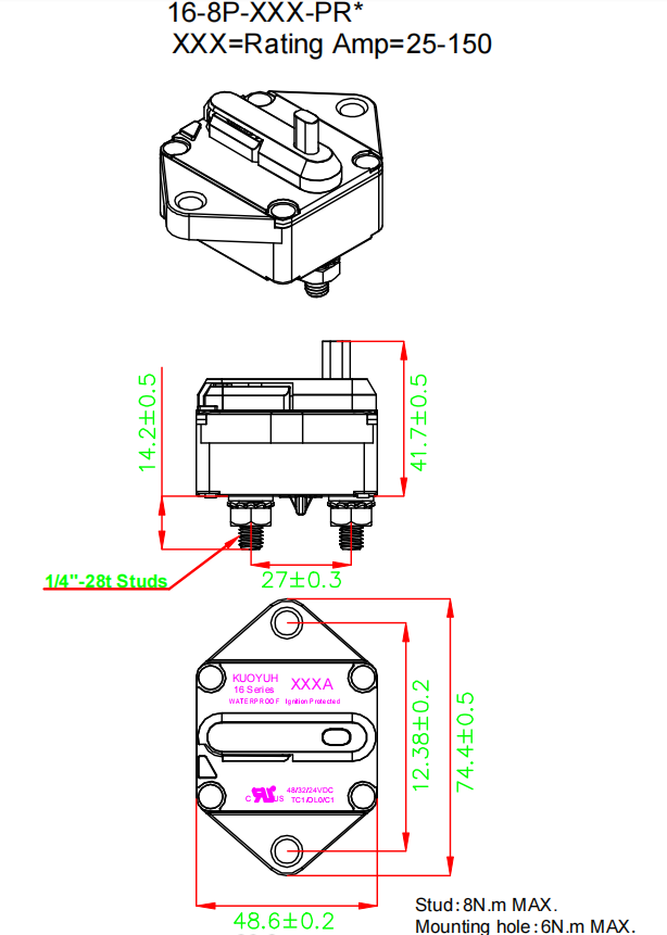 額定電流(Current rating range):30A-150A 額定電壓(Input voltage rating ):12/24/32/48VDC 限制短路電流(Interrupting capacity): 2000A/32VDC Type I 2000A/14VDC Type II 1500A/48VDC Type III 介電強度(Dielectric Strength):>1500VAC/min 絕緣電阻(Insulation Resistance):>100MOHM(DC 500V) 防護(hù)等級(Degree of protection):IP66 復(fù)位時間(Reset-Time):<60sec 工作環(huán)境溫度(Operating Temperature Rating):-30℃-80℃ 儲存溫度(Storage Temperatur Rating):-30℃-140℃ |