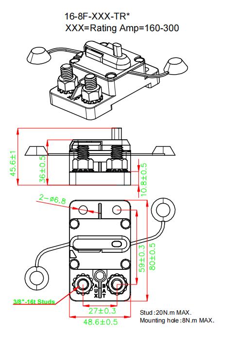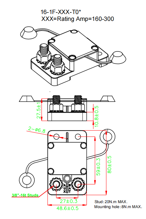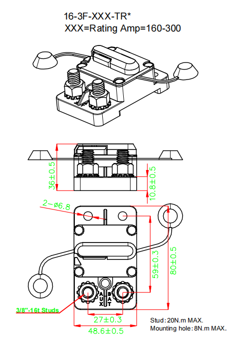 額定電流(Current rating range):25A-300A 額定電壓(Input voltage rating ):12/24/32/48VDC 限制短路電流(Interrupting capacity): 2000A/32VDC Type I 2000A/14VDC Type II 1500A/48VDC Type III 介電強(qiáng)度(Dielectric Strength):>1500VAC/min 絕緣電阻(Insulation Resistance):>100MOHM(DC 500V) 防護(hù)等級(Degree of protection):IP66 復(fù)位時(shí)間(Reset-Time):<60sec 工作環(huán)境溫度(Operating Temperature Rating):-30℃-80℃ 儲(chǔ)存溫度(Storage Temperatur Rating):-30℃-140℃ |