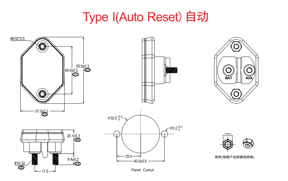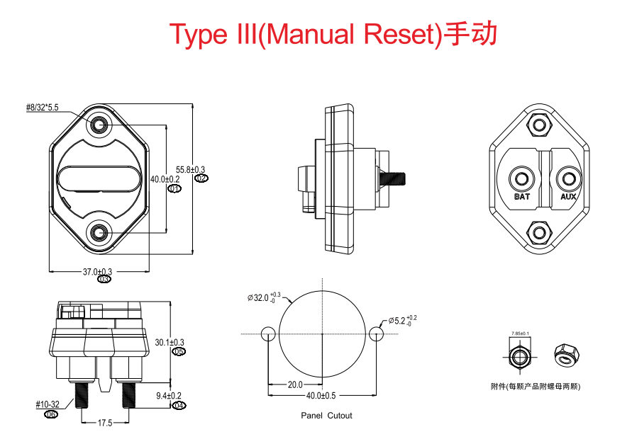 額定電流(rating):10A-60A 輸入電壓(Input Power):125VAC/250VAC/32VDC 50-60Hz 耐電壓強度(Withstand voltage strength):1500VAC/1min 漏電電流≤0.5mA(1500VAC/min,the leaked current is less than≤0.5mA) 絕緣電阻(Insulation Resistance):500VDC1Min≥100MΩ 額定短路能力(Rated short-circuit capacity):125VAC/1000A,250VAC/1000A 額定通斷能力(Rated breaking capacity):6倍額定電流(6 times rated current) 復(fù)位方式(reset):手動復(fù)位(Manual Push Reset)/自動復(fù)位(Auto Reset) 復(fù)位時間(Reset Time):60s"內(nèi)回復(fù)(Within 60s") 脫扣特性(Tripping characteristics) 測試環(huán)境溫度(The test environment temperature):25℃±3℃ 額定電流200%(200% of Ratcd Currcnt):8-40s" 內(nèi)脫扣(8-40s" Seconds Trip) 額定電流150%(150% of Rated Current):一個小時內(nèi)脫扣(Trip within 1 Hour) 額定電流100%(100% of Rated Current):保持不脫扣(Hold,No Trip) |